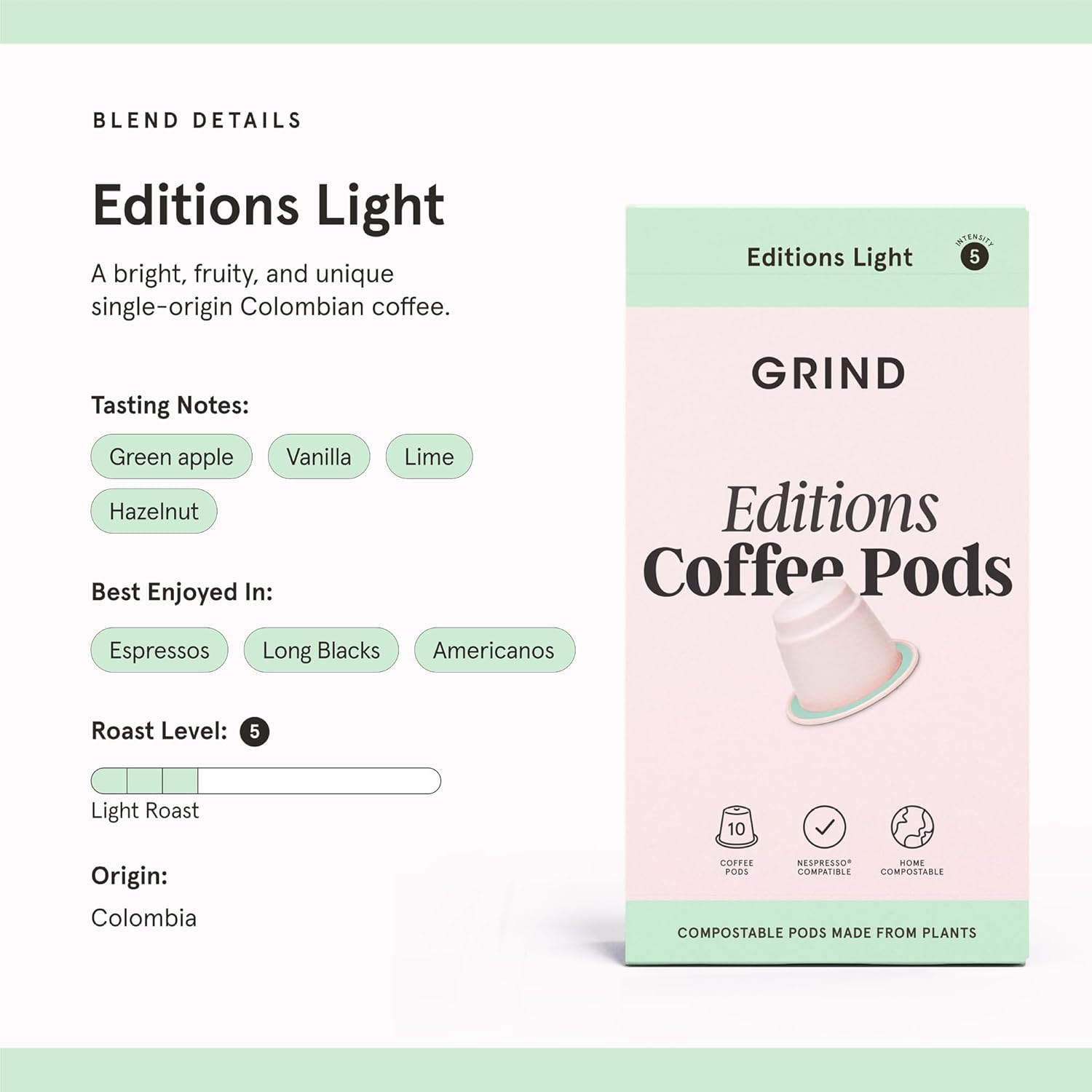 Experience guilt-free Colombian coffee - choose Grind Colombia Light Coffee Pods for bright, vibrant flavour with single-origin quality, biodegradable capsules, home-compostable convenience, and barista-grade excellence in every cup.