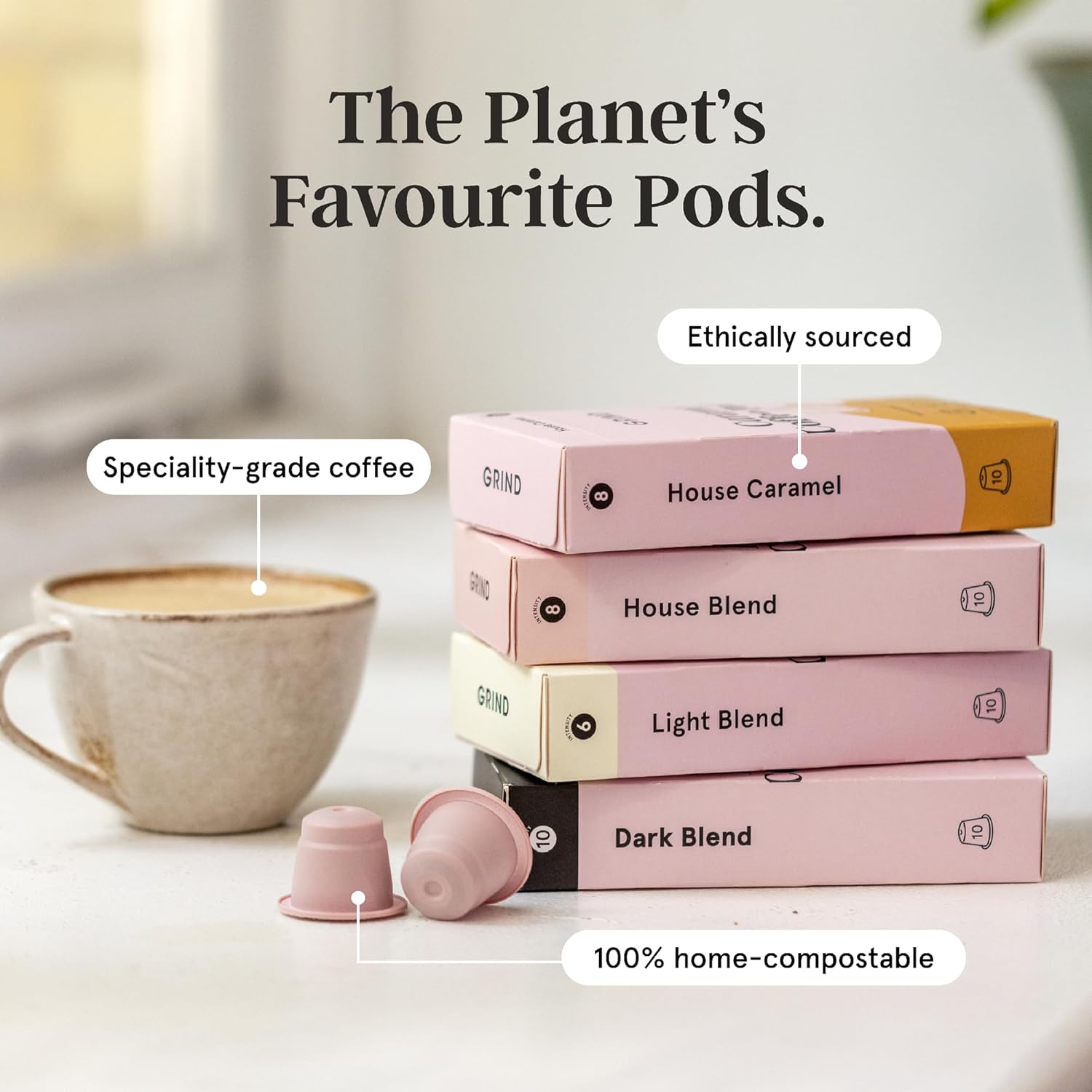 Experience guilt-free bold coffee - choose Grind Dark Blend Coffee Pods for rich, chocolatey flavour with 100% Arabica quality, biodegradable capsules, home-compostable convenience, and barista-grade excellence in every cup.