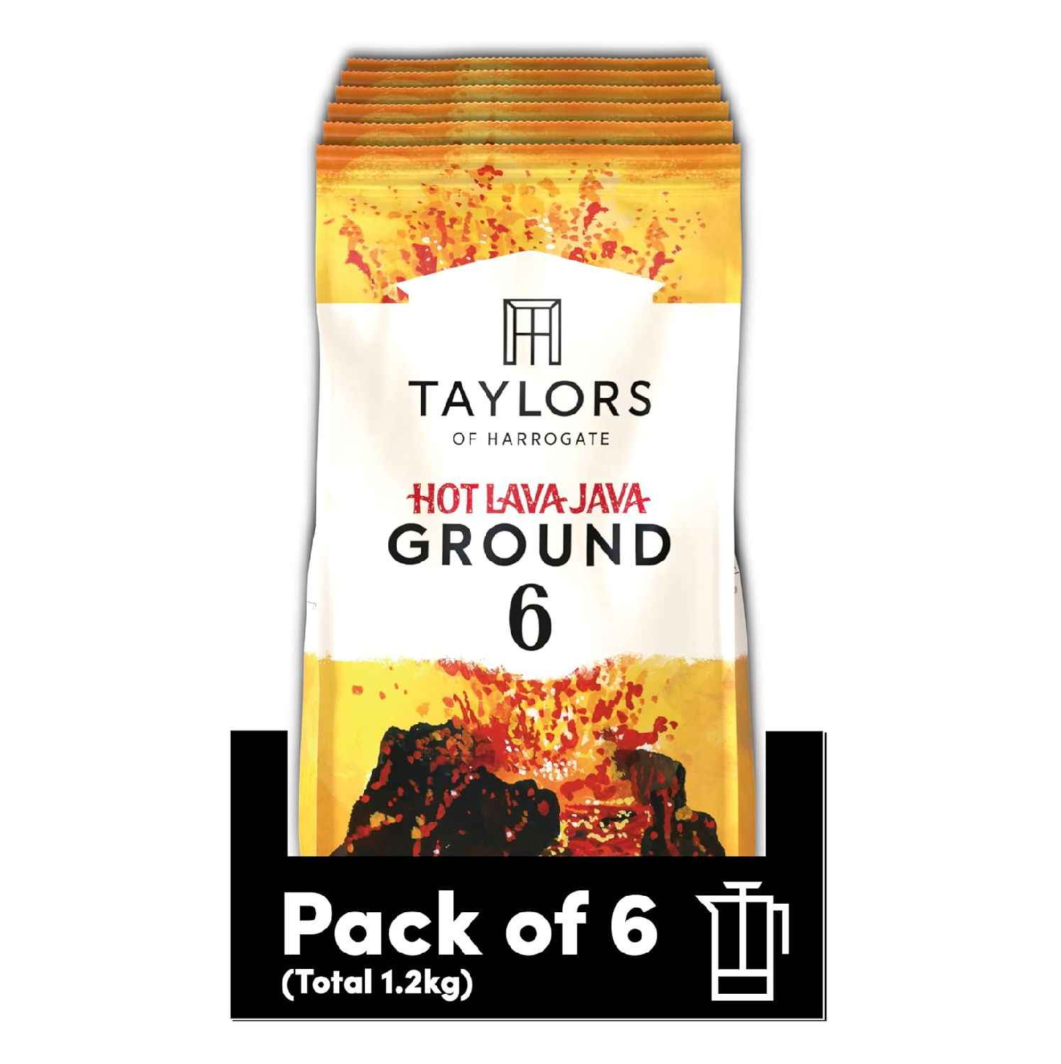 Ignite your senses with the bold, intense taste of Taylors of Harrogate Hot Lava Java Ground Coffee. This premium multi-pack delivers six 200g bags of expertly roasted, dark ground coffee with a powerful, fiery character. Perfect for those who crave a strong, full-bodied coffee with serious intensity and depth.