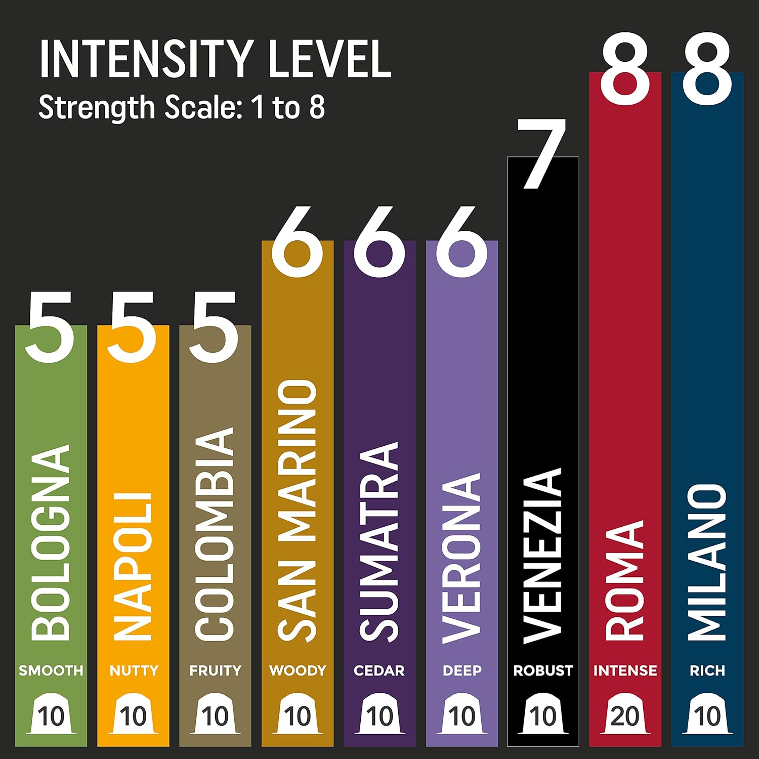 This 100-capsule variety pack is perfect for coffee lovers who appreciate diversity and want to explore different coffee styles without committing to a single flavour. With 9 different varieties included, you can experience a range of intensities from light and aromatic to bold and powerful, discover different roast profiles from light to dark, and explore various flavour characteristics from fruity and floral to rich and chocolatey.
